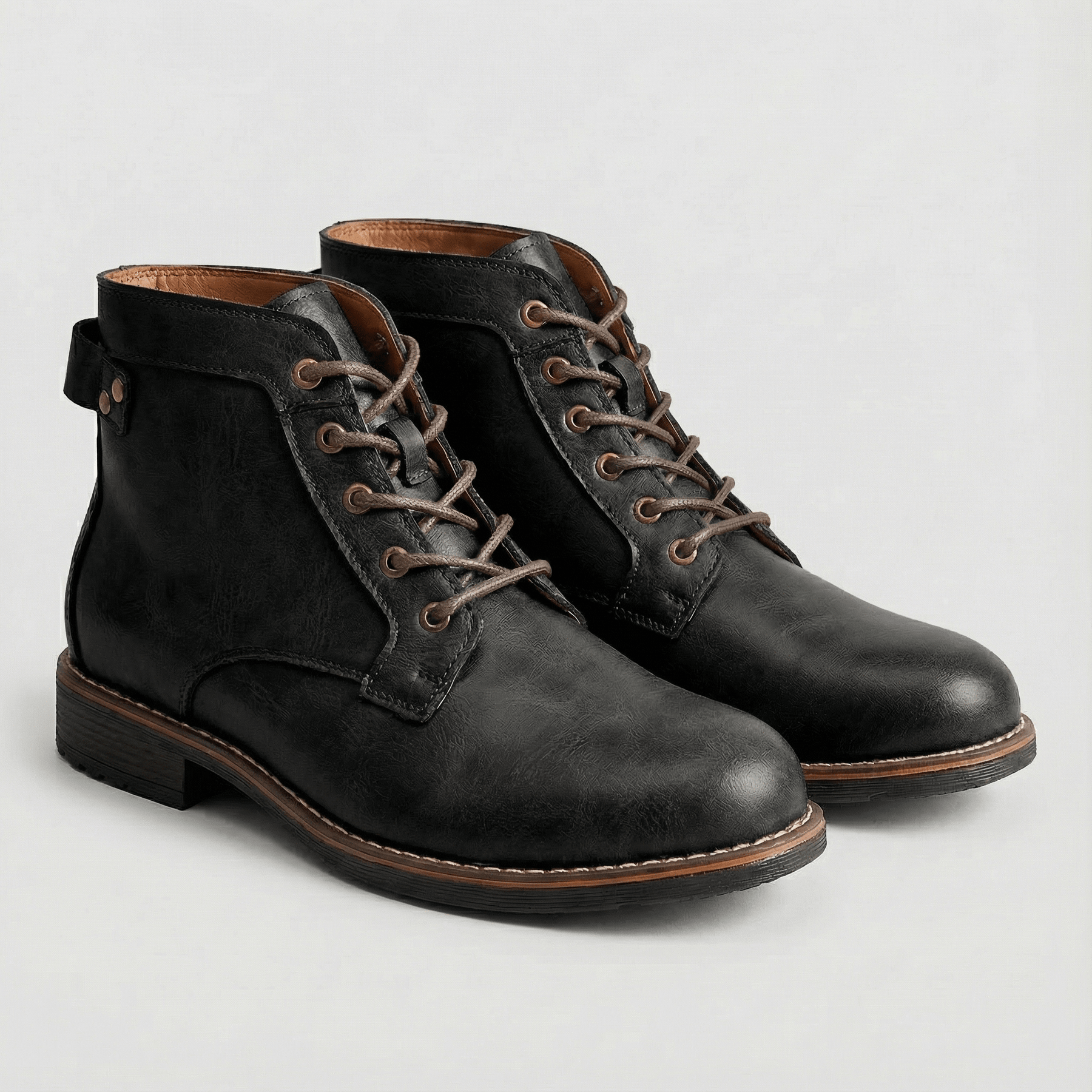 Ankle-height men lace-up boots that have a round toe front and a pull-tab at the heel, including double-row stitching around the heel section