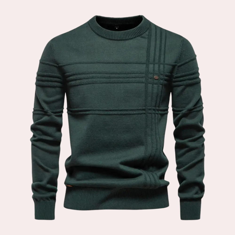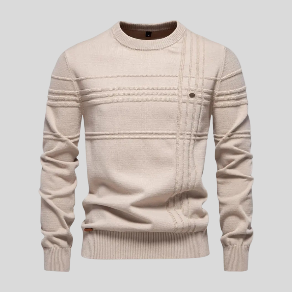This long-sleeved crew neck sweater features ribbed detailing at the collar, cuffs, and hem for added structure. Horizontal textured lines are woven into the knit across the chest and upper sleeves, creating a layered effect. On one side of the chest, additional stitched vertical lines intersect with the horizontal lines, adding an asymmetrical detail that gives depth to the minimalist silhouette. The sleeves are straight with a gathered effect at the forearms, and the body retains a regular fit with a clean, balanced shape.