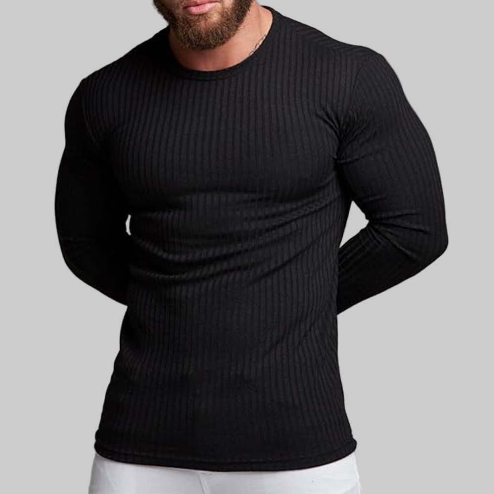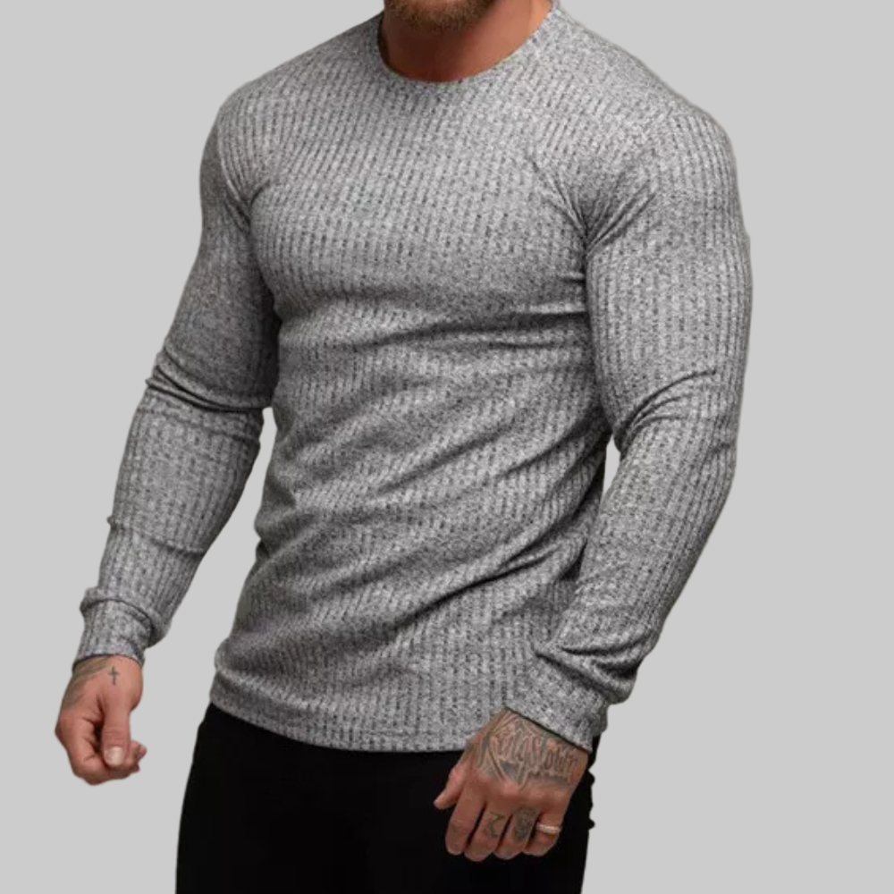 This men's sweater features a fitted cut that follows the line of the chest and shoulders. It has a classic round neckline, held in place by a regular finish that clearly defines the neckline. The long sleeves end in ribbed cuffs, while the bottom hem has a similar finish, providing a uniform structure.