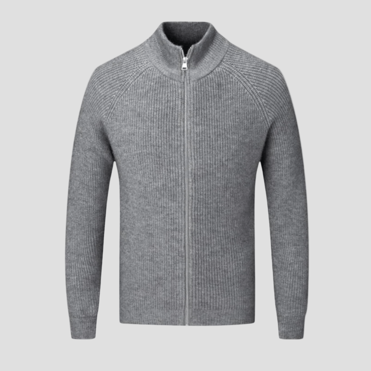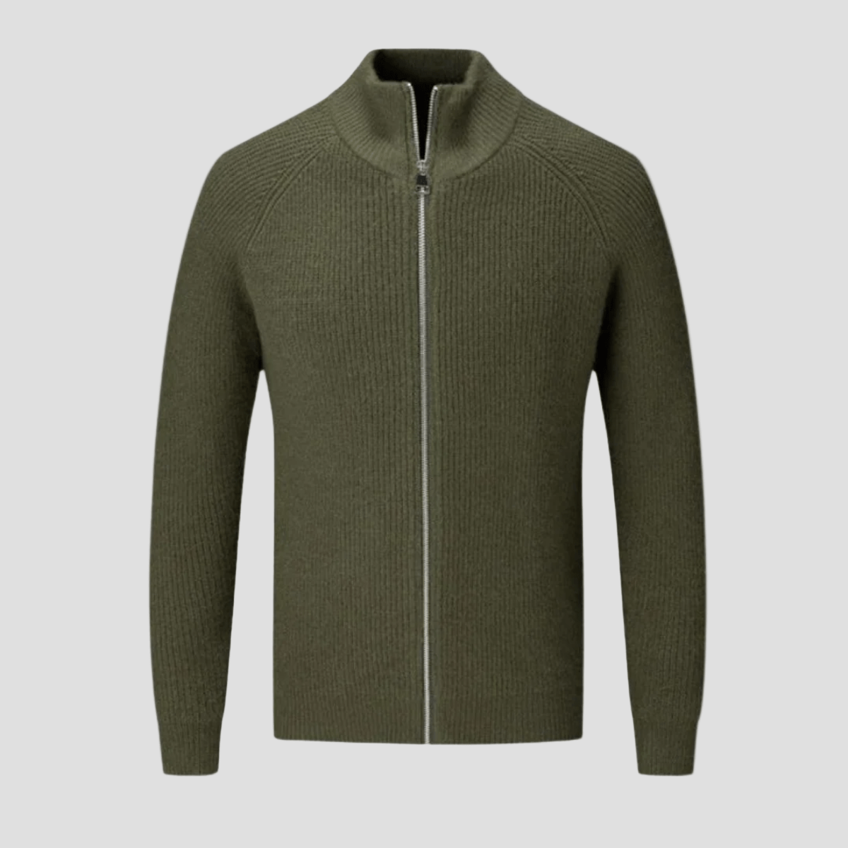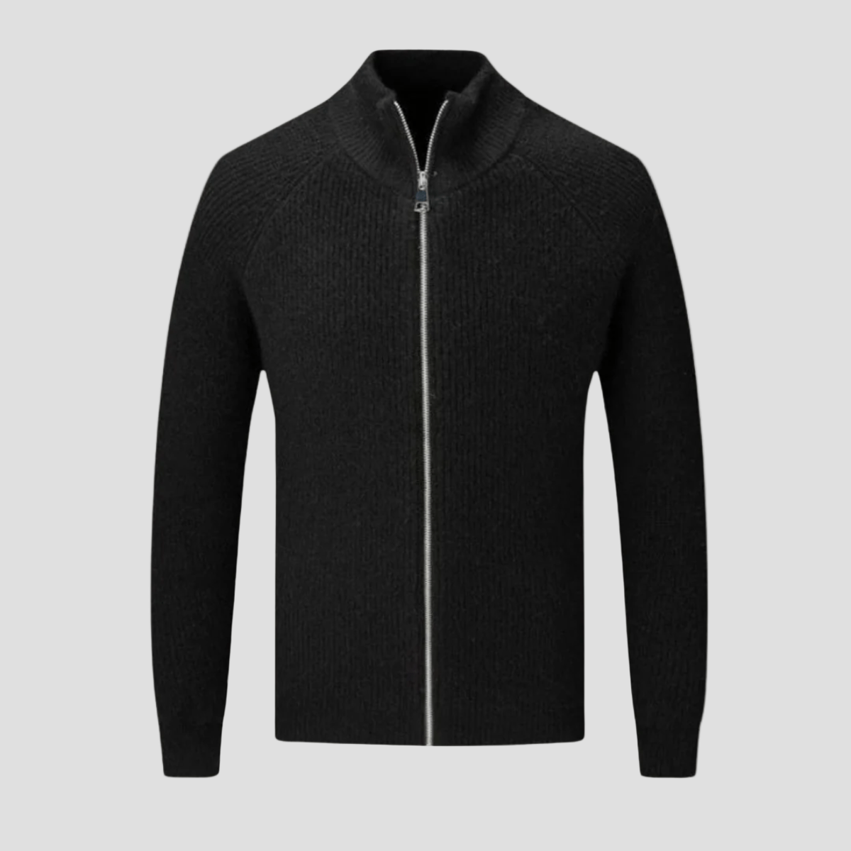 Sweater with a full-length zipper closure and a structured stand collar. The body and sleeves feature a pronounced vertical ribbed knit pattern, creating a consistent texture throughout. Finished with clean seams and a uniform knit density for a structured, streamlined appearance.