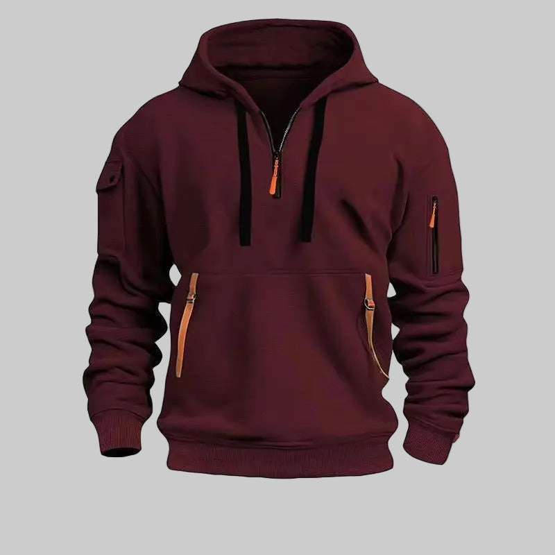 This hoodie features a zipper closure at the collar and long sleeves. One pocket is positioned on one sleeve, while another extends horizontally from one side of the garment to the other.