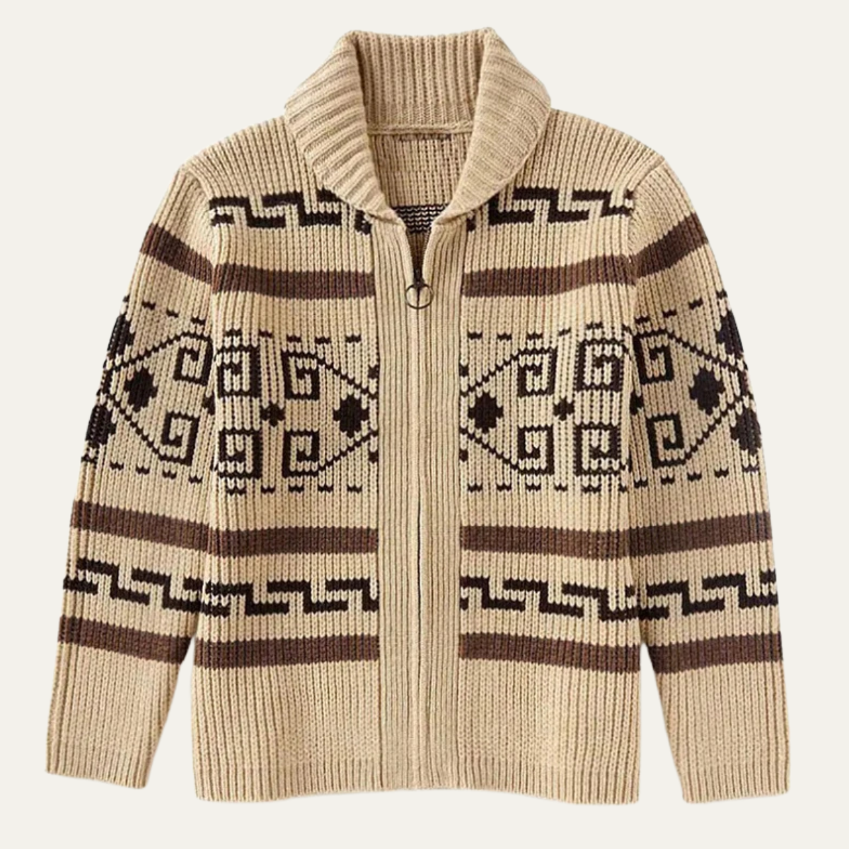 Long-sleeve knit cardigan with a shawl-style collar and full front zipper closure. Features a ribbed knit structure, all-over geometric pattern, and straight-cut silhouette. Includes ribbed cuffs and hem, set-in sleeves, and consistent pattern alignment across the body and arms.