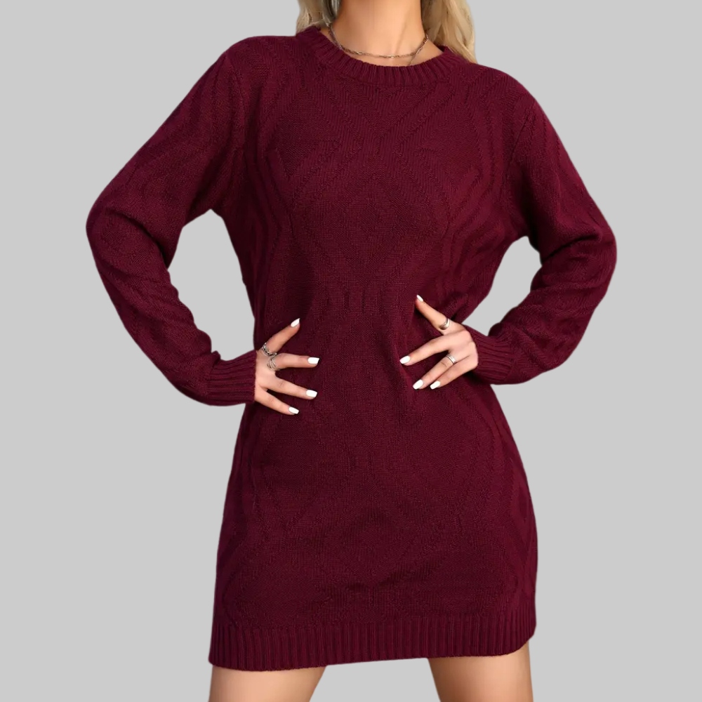 This women's dress features a simple round neckline and long sleeves. The cut is straight and falls above the knees. The fabric is covered with a diamond pattern evenly distributed across the entire garment.