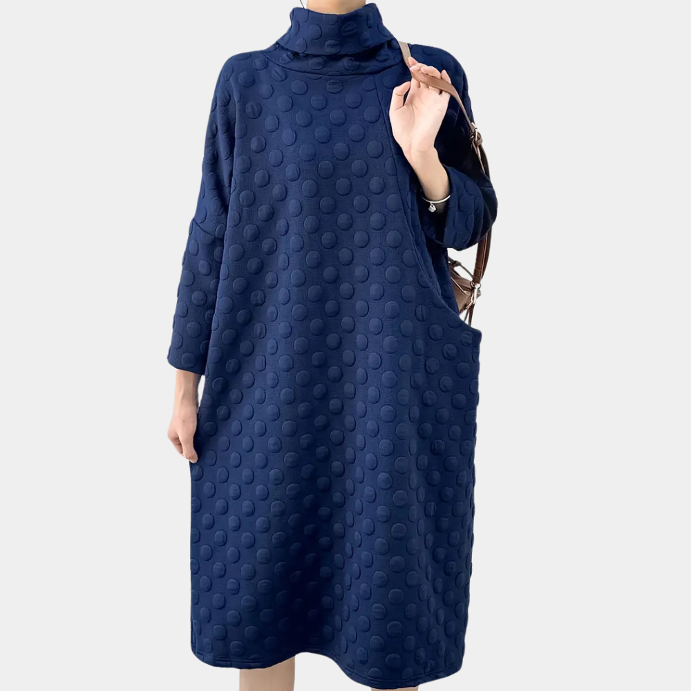 This women's dress features a high neck and a polka dot pattern evenly distributed across the garment. The cut is straight and slightly loose, creating an oversized effect, and falls to the knees. The sleeves are long with simple cuffs. The dress has two side pockets integrated at the hips.
