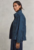 Women's jacquard jacket with patchwork pattern. Straight cut with stand-up collar and curved button placket with fabric-covered buttons. Long sleeves with buttoned cuffs. Drop waist with drawstring. Two piped pockets at the waist with button closure. Fully lined jacket.