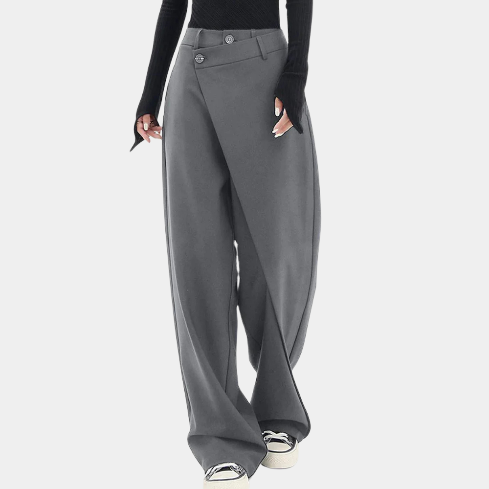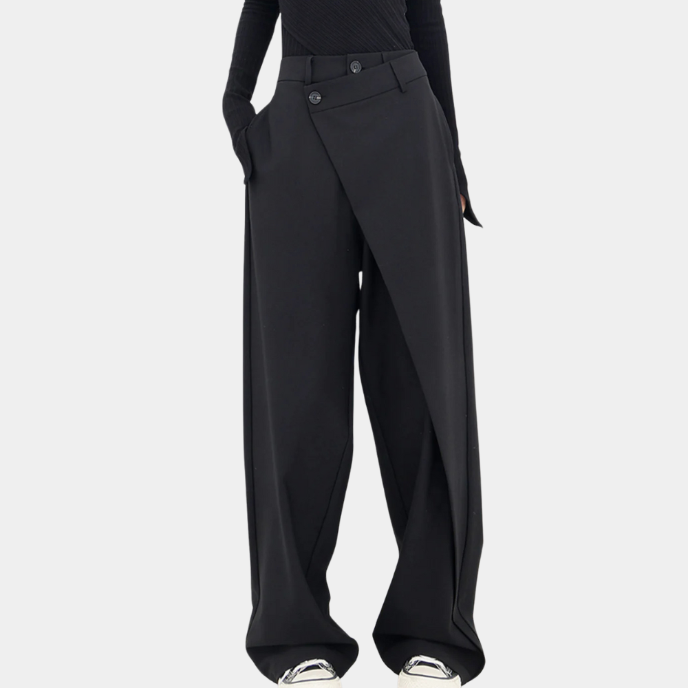 These women's pants feature a wide cut with an overlapping front panel that closes asymmetrically at the waist with buttons. The waistband includes belt loops and a concealed closure under the crossover detail. The cut is long, falling to the shoes, with extra volume at the legs for a draped effect. The design creates a layered effect at the front, emphasizing the crossover construction.