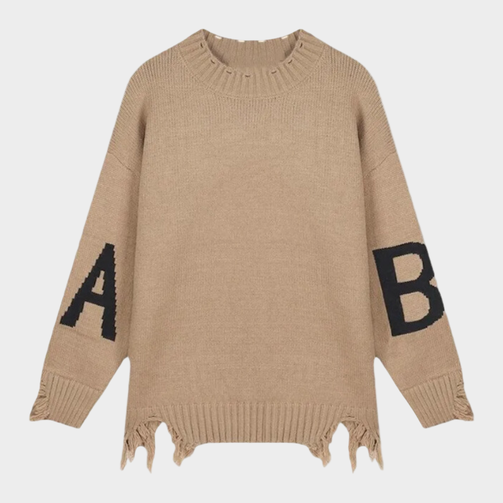 This women's top is a crew neck, long sleeve sweater. The sleeves feature lettering detail on the outer side of the sleeves, extending to the cuff. The body has a standard fit with a straight hem at the waist. The garment has no additional closures or fasteners.