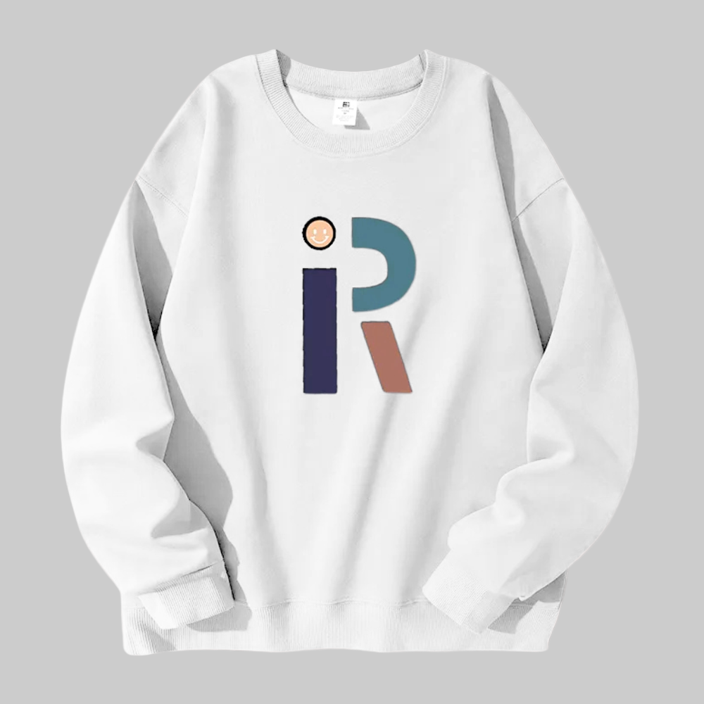 This sweater features a loose fit with a crew neck. A narrow band finishes the hem and cuffs, creating a clean finish. The sleeves are long and integrated into the straight structure of the garment. A subtle pattern is placed in the center, adding a slight visual variation.