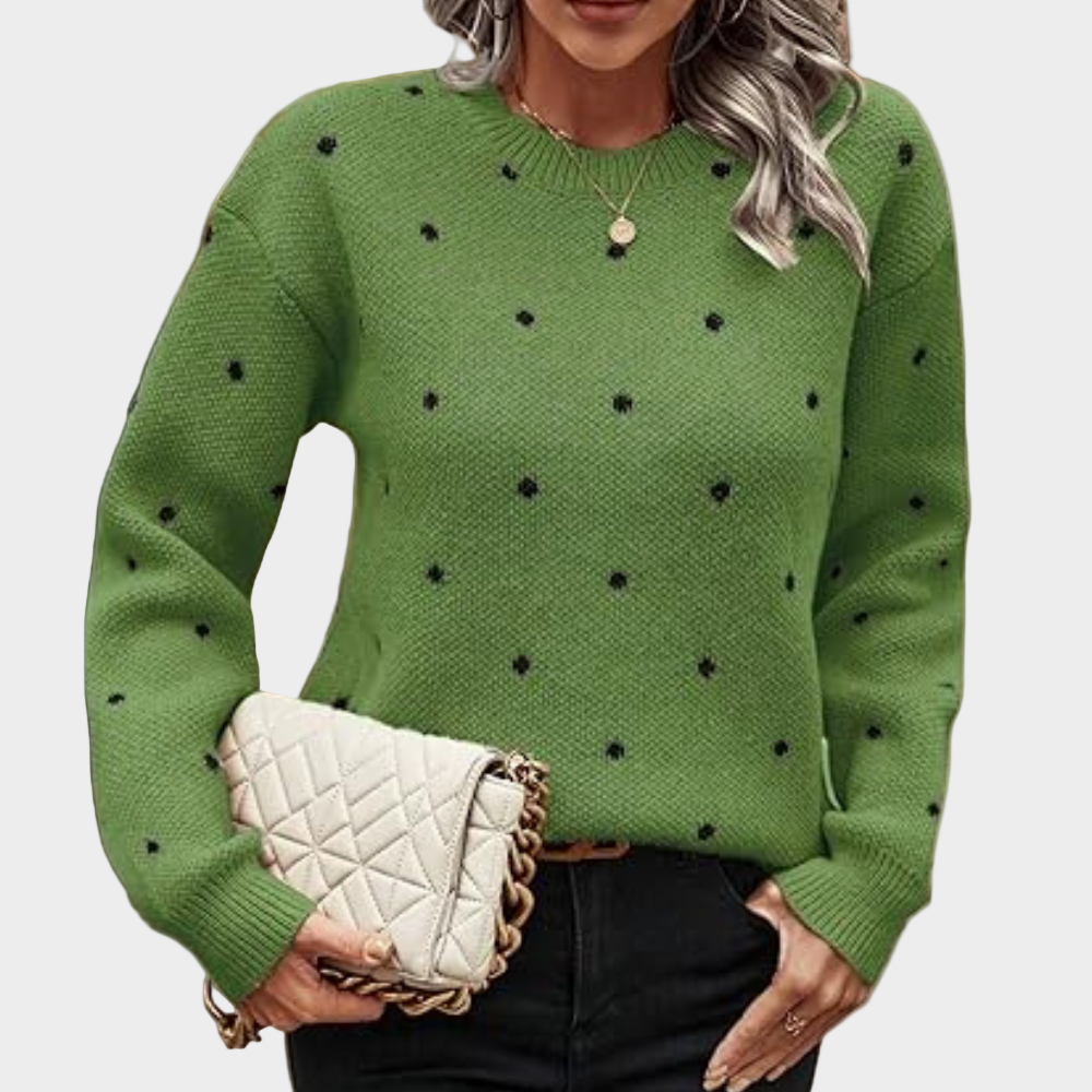 This polka dot sweater has a simple look with a regular pattern that catches the eye without being too much. The straight cut and subtle details give it a clean look. The round neckline frames the top of the bust with simplicity, while the long sleeves extend the overall look without being too busy. The polka dots are evenly distributed across the garment, adding a graphic contrast to the overall look.