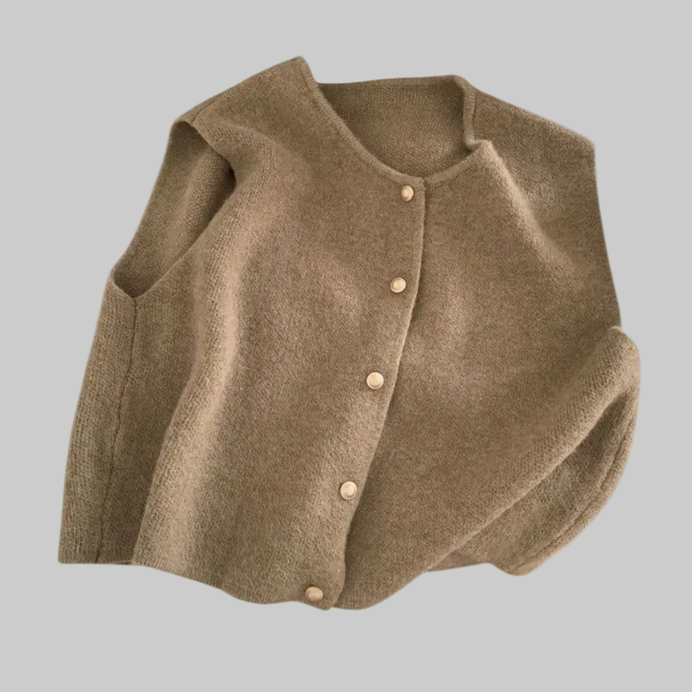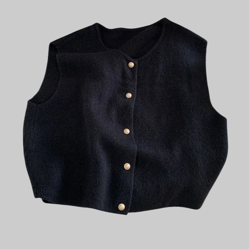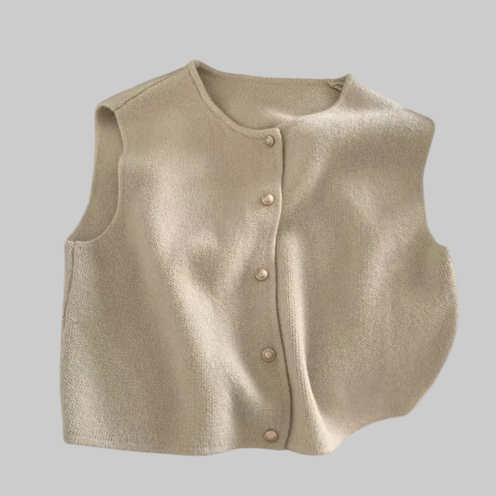 This is a sleeveless cardigan with buttons down the front. Its straight cut falls just below the waist, creating a clean, minimalist silhouette. The front closure features evenly spaced rounded buttons in a matching color, adding subtle structure. The shoulders are slightly broadened, giving the vest a defined outline without adding volume. It is worn over a long-sleeved blouse, emphasizing its use as an outer layer for style. The hem is straight and the overall look is simple and balanced, ideal for layering.